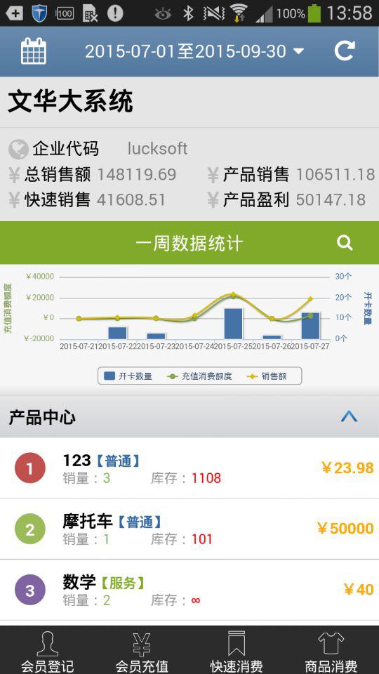 这款APP跟极悦注册会员系统进行了对接,里面的会员,产品以及消费积分数据都是实时同步的。不论您是在系统里操作还是用手机APP操作。都是可以实时的了解每一位会员的消费情况以及每一个商的整体营业额。下面小编来详细的一大介绍一下这款新上线的手机端APP。