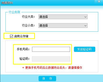 选择好行业分类之后,勾选“启用云存储”。然后,在下方输入手机号码,点击发送验证码,然后会收到一条署名“会员通”的短信,填入收到的验证码,点击保存即可启用云存储。