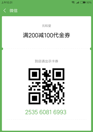 通过微信发送的电子优惠券,微信公众号会推送卡券给每个微信会员。会员点击领取后可以赠送给朋友进行使用。然后会员到店消费的时候,可以直接出示卡券二维码给商家扫码核销。