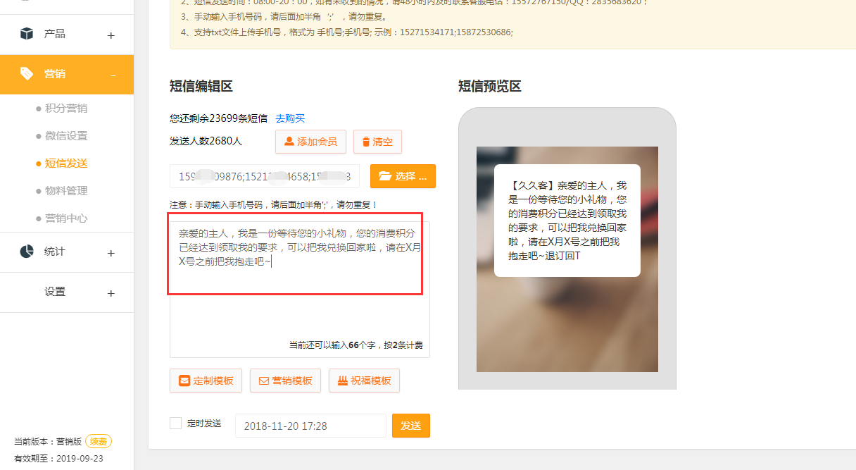 3、能提供短信营销功能,客户消费提醒、充值消息提醒、会员生日问候等;