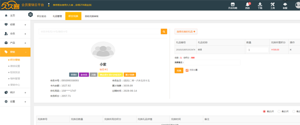 2、会员关注商家微信公众号后,可以随时随地在公众号平台查询自己的消费情况和积分情况。商家也能在会员管理系统中快速查询会员积分的累积情况,根据累积积分数量可以兑换不同的礼品,且支持线上、线下都可以进行兑换。会员消费后,消费明细和积分变动情况都能及时以短信的方式发送给会员,一目了然,让会员及时知晓。